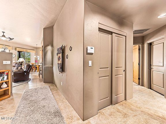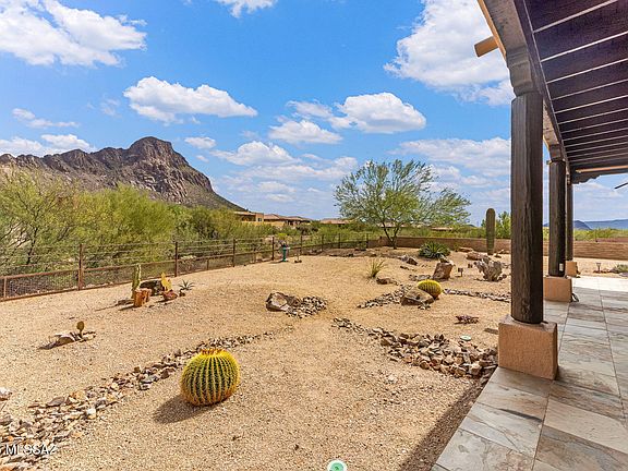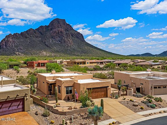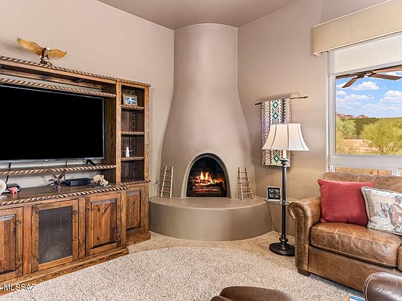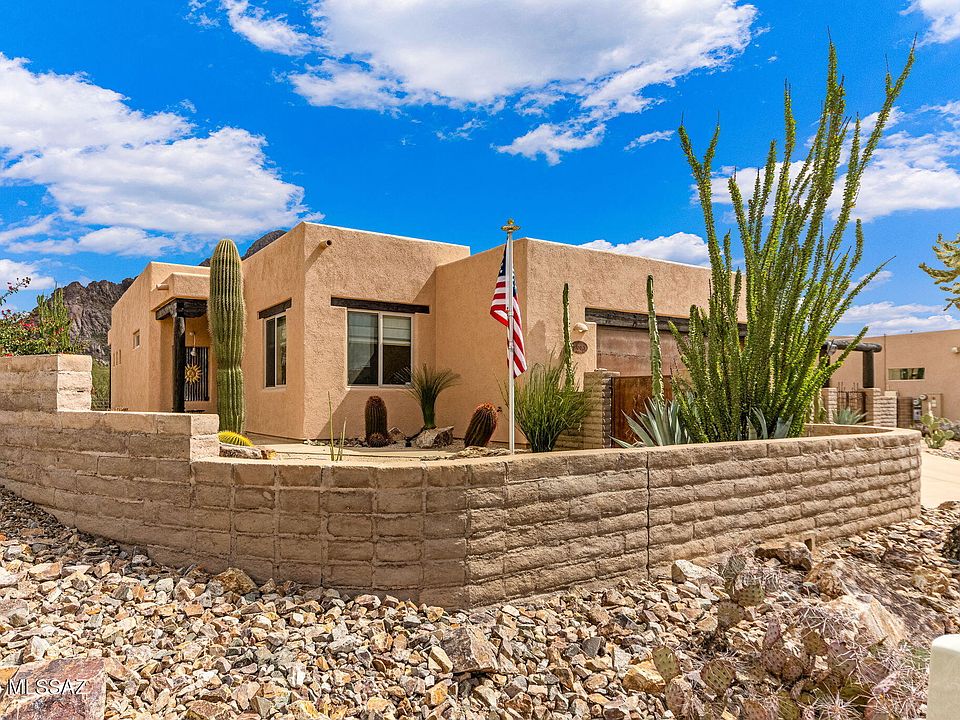 Nestled in the Tucson Mountains you'll find this rare Santa Fe gem built and designed by John Herder. A true quality home located on a .25 acre quiet and peaceful cul-de-sac lot. Home offers architectural character w/ custom artistic details at every turn. Beams, high ceilings, gas beehive fireplace, unique niches, picture windows, custom knotty elder cabinetry and doors throughout. Great room opens to kitchen with many classic Santa Fe details. Primary bedroom retreat w/primary bath featuring dual vanities, separate tiled walk in shower, walk in closet, doorway to covered back patio. Home has recently been freshly painted, new gas water heater 9/2025. Separate laundry room includes cabinets, washer & dryer. Backyard backs to private wash and extraordinary mountain views. Must see today!