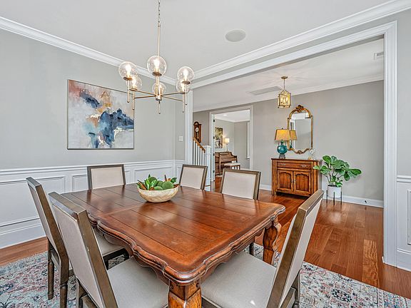 Oversized lotOverlooks a serene pondPrimary bedroomAbundance of natural lightGenerous baseboardsElegant crown molding