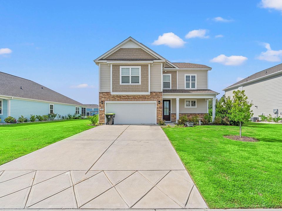 Welcome home to this beautiful open 4 bedroom, 2 1/2 bath home which is located in the very popular Lakes community in Myrtle Beach, South Carolina. Stacked stone elevation, inviting front porch, and 8 ft. entry door with glass. Beautiful wide plank laminate flooring flows through the foyer, kitchen, living room, and dining room with tile in the bathrooms and laundry room. The kitchen has granite countertops, tile backsplash, stainless Whirlpool appliance, walk-in pantry including a gas range with a large breakfast bar and dining nook. The oversized owners' suite is on the first floor with a walk in closet. The ensuite has double sinks and a walk-in tile shower. The other 3 nice size bedrooms and loft are on the second floor and share a full bathroom that has a tub/shower combo. The loft is perfect for another living area or office. Just minutes from the beach, golf courses, the Myrtle Beach Boardwalk, Sky Wheel, dining, entertaining, hospitals, shopping and the Myrtle Beach International Airport. The Lakes is a community that allows you to golf cart to the beach if you wish. Sliding glass doors off the dining area lead to the rear screen porch that overlooks the pond creating a seamless transition from indoor to outdoor living. Schedule your showing today! Square footages are approximate.
