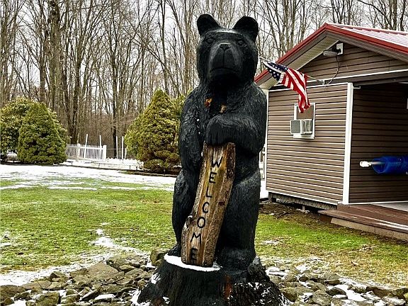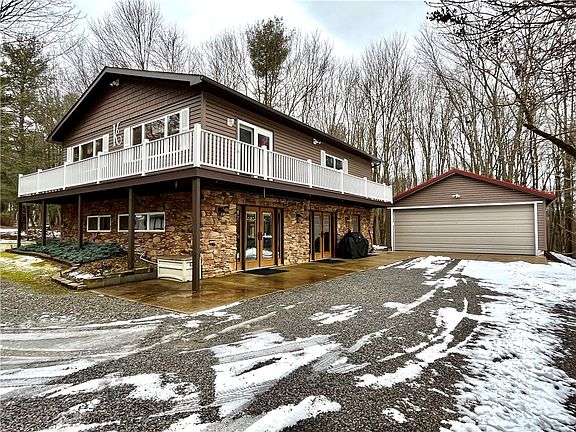 If privacy is what you are looking for this is it Enter from the winding driveway to be greeted by the friendly carved bear. Property opens up to the 2-car detached garage with additional workshop, then to the fenced raised bed garden area to the heated pool with large pool house with small kitchen and heated/ac hobby area. Surrounded by a covered/uncovered deck area and then on to the firepit with lots of firewood for entertaining around the fire. The home features a newer composite wrap around deck and a widows walk from the 2nd bedroom overlooking the forest. This home has many updated feature's, new vinyl siding, roofs and gutters on all the buildings, newer furnace, and 3 new elegant front entry doors. Don't worry about being left in the dark here because there is also a new Generac Generator. This is a must see home