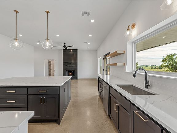 Discover the ultimate blend of modern luxury and tranquil countryside living with this exquisite 3 bedroom 2 bath barndominium, perched on a scenic hill in Cameron, Texas. Set on 10.61 acres of ag-exempt land, this home offers unparalleled serenity and stunning views of the lush, soul-soothing landscape. Step inside to experience a contemporary design featuring quartz countertops throughout, elegant oak cabinetry, and an oversized island for hosting. The primary suite is a true retreat, complete with a vast, three tiered walk-in closet and a luxurious drop-down tub that overlooks the rolling pastures. Enjoy high ceilings and a thoughtfully designed split floorplan, providing both openness and privacy. The custom-fabricated metal fireplace and floating kitchen shelves add a touch of sophistication, while the covered porches on each side offer ideal vantage points for breathtaking sunrises and sunsets. The large garage, with epoxy flooring and a basketball goal, provides ample space for vehicles and recreational activities. This custom-built home, created by a renowned builder, seamlessly integrates modern amenities with the serene beauty of its rural setting.