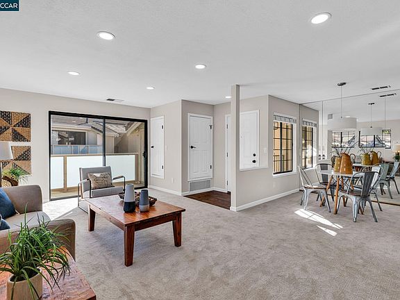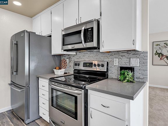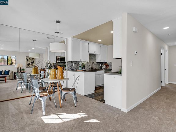Exceptional top-floor, end-unit condo with a private garage in the gated Fostoria Terrace community of Danville. Step into a spacious, light-filled living area, enhanced by recessed lighting and a flowing layout that’s perfect for relaxing or entertaining. The open design creates a welcoming atmosphere, complemented by a modern kitchen featuring stainless steel appliances, quartz countertops, and abundant storage, along with a dedicated dining area. The generously sized primary suite offers a tranquil retreat with a large mirrored closet and an ensuite bathroom. The second bedroom provides flexibility, with a mirrored closet and easy access to the full hall bathroom. A dedicated laundry closet with built-in cabinetry enhances the home’s functionality. Community amenities include a playground, dog park, putting green, and BBQ picnic area. Conveniently located near the Iron Horse Trail, downtown Danville, shopping, dining, Costco, top-rated schools (including Greenbrook Elementary), and major freeways for effortless living.