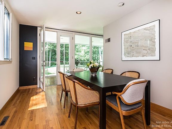 Set high on a hill this classic Mid Century Modern masterpiece (1962) was built by Edward Olencki and meticulously maintained. The newly painted white exterior adds to the serenity of the light filled spaces. With many oversized windows, light-toned wood surfaces, and tall ceilings, the natural outside light shines inside. The house is sited so it's impossible to comprehend the full scale of this house as it reaches into the surrounding park area. Featuring 4 bedrooms and 2.5 renovated bathrooms with open family sharing spaces. The open modern stairwell is an essential architectural gem. Large upper level Great Room with fireplace and wood floors. Open dining room with built-in cabinets and a beautifully crafted kitchen with updated appliances. The primary suite has a state of the art tile bathroom. The entry level showcases 2 bedrooms and a full tile bathroom, plus a family room with built-in storage and doorway entrance to a private courtyard. Bonus flex space located behind the family room wood divider, great for an office! Large laundry and storage area. The renovated screened porch provides an infinity view of the Huron Hills Golf Course woods which provides protected privacy and a sense of serenity with pure nature.