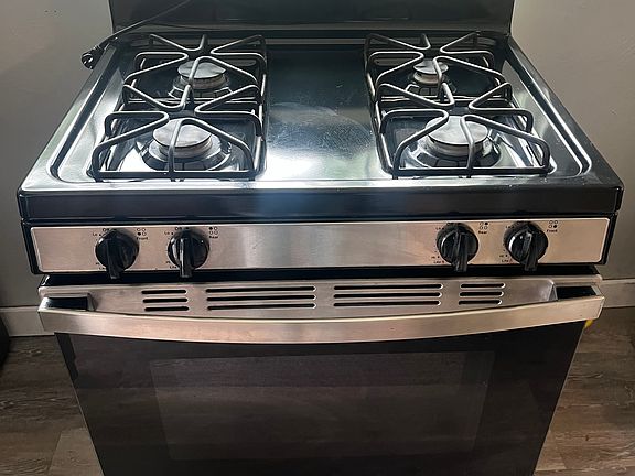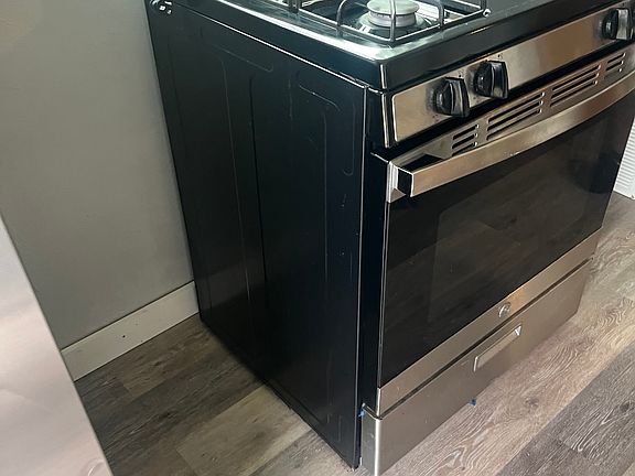 * Kitchen: Enjoy cooking with new stainless steel appliances, including a modern side-by-side refrigerator with a water dispenser and a gas range/stove (shown in black and stainless steel). The kitchen also features durable and attractive new wood-look vinyl plank flooring that extends into the surrounding area, complementing the natural wood cabinets.