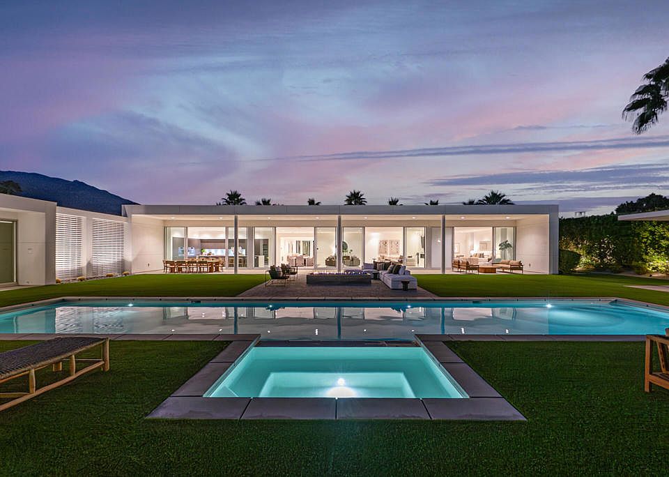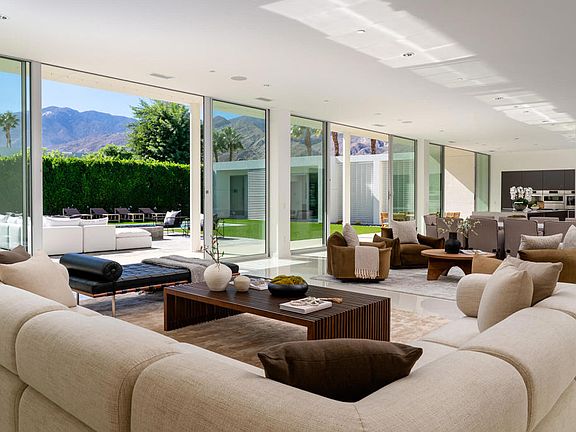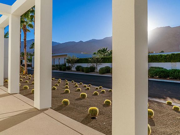 Rare offering within LINEA, a private gated community of only 14 homes in south Palm Springs. 3088 Linea Terrace features minimalist architecture with an artist's attention to visual rhythm, massing and scale. Anchored by a 90-foot expanse of oversized Fleetwood glass sliders facing a 60-foot lap pool, the proportions are grand and harmonious. Linea is an exceptional neighborhood - 14 all white modern homes sited for maximum privacy. 3088 Linea Terrace has perhaps the best street presence - elevated lot, stunning colonnade -- and features the award-winning G floor plan. The soul of this home is its simplicity. The design is clean and bold, the spaces expansive, the landscape low-maintenance. The setting in Andreas Hills is epic, just minutes from central Palm Springs, nestled between mountains on all sides. Four bedrooms and five baths. The main house features the primary suite and two well-separated guest suites, as well as a dedicated media room. The attached one-bedroom casita has its own street entrance. Linea has its own private gate but the HOAs are very low, and you own the land. Three-car garage, fully owned solar, pergola with outdoor kitchen (including wet bar, grill and refrigerator), outdoor shower, covered patio with misters, enormous steam shower in primary. Built for entertainment or your fortress of solitude, minutes from downtown Palm Springs and all its amenities.