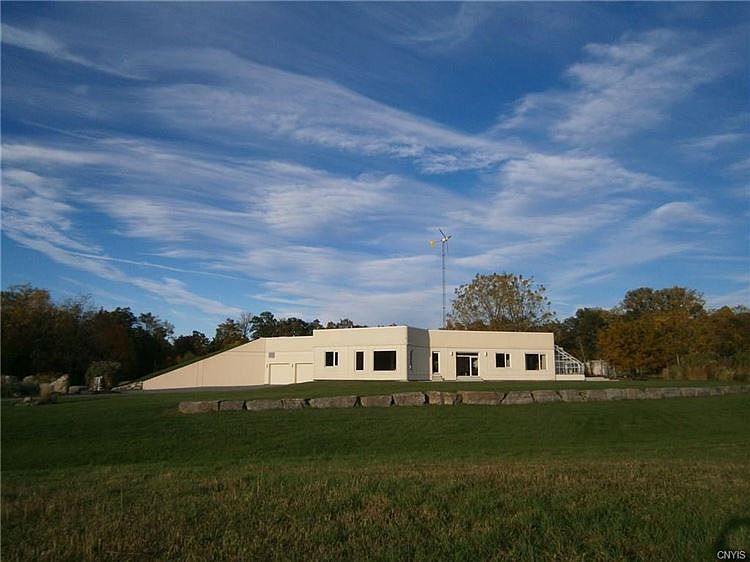 This Green home located North of village of Aurora with energy producing & conserving features is set on the east shore of Cayuga Lake with 354 feet of water frontage in the heart of the Finger Lakes has attached 1500 sq foot garage. Features include 10' ceilings ,cork floors , handcrafted solid cherry & red oak window sills, a master bedroom suite with dressing room & craft room, library, wine cellar. Curving bluestone patio walk adjacent to the deck & greenhouse with spa overlooks 72 acres of grassy fields & woods. Breathtaking views of the lake. 3/4 acre organic fruit tree & vegetable garden with 10'x 12' barn. Solar panel array, wind turbine, diesel generator backup. 3 bedroom , 3 bath guest home facing lake with 2 car detached garage. Approx. 2400 sq ft. included in sale.