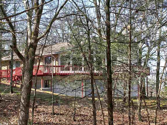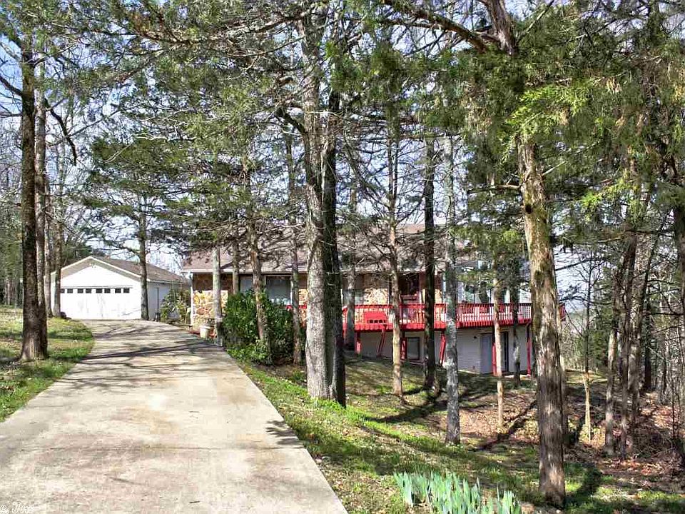 Contemporary style rock & siding home nestled in the trees but with gorgeous views, overlooking the west Searcy valley. Massive main floor living area with floor to ceiling windows, flooding the room with light & nature, plus a wood-burning fireplace. Open kitchen area has been updated with new appliances. Master on main level with 2 add'l bedrooms on the lower level. 2nd living area with 2nd fireplace on the lower level as well. Guest bedrooms, along with roof & freshly painted deck were updated in 2020.