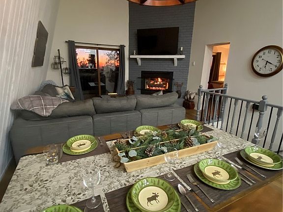 Enjoy a peaceful, scenic commute to work while living in this cozy retreat that is designed with energy efficiency in mind. The home boasts thick insulated walls, a whole-house humidifier, and modern updates throughout. The open floor plan seamlessly connects the kitchen, dining area, and living room, all centered around a warm brick fireplace, perfect for those chilly mountain evenings. you'll find a bonus-size game room, providing plenty of space for fun and entertainment for everyone. With five spacious bedrooms and stunning views, this home offers a perfect space for relaxation or a vacation rental opportunity.