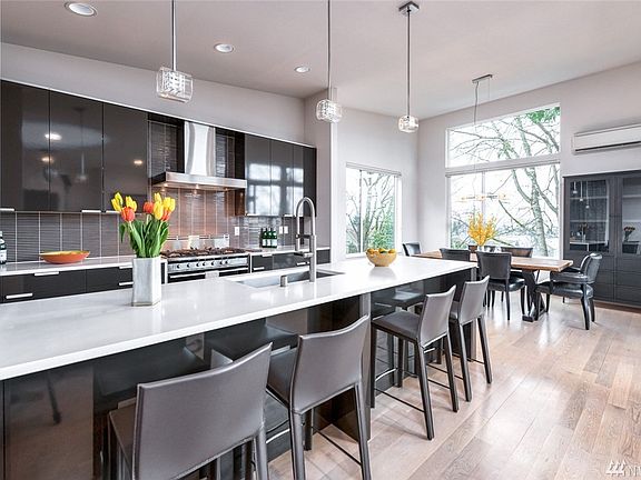 This spectacular home feels like your own in-city retreat! Designed by Medici Architects this light filled, stunning home features a spacious high end kitchen w/Fisher Paykel appl's, master suite w/large walk-in closet & lux porcelain tiled bath, soaring 12'+ ceilings, 2 add'l beds each w/en-suite baths, custom metal railings & fully finished 2 car garage. Covered deck off dining brings outside in w/views of the lake & mtns. Low maint yard, A/C & easy access dwntn & Cap Hill complete this home.