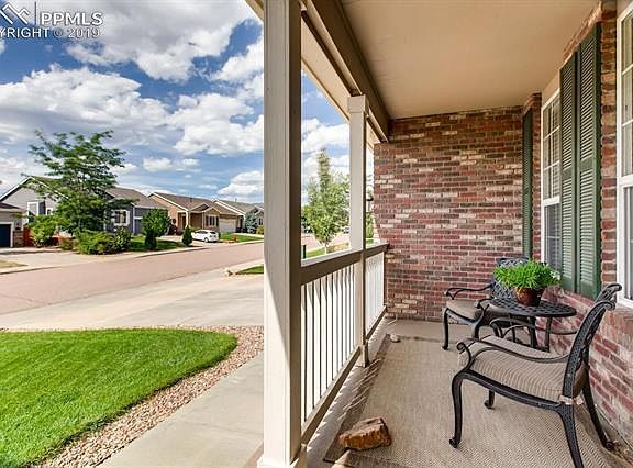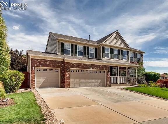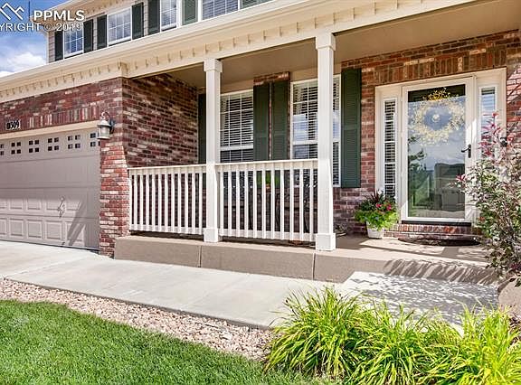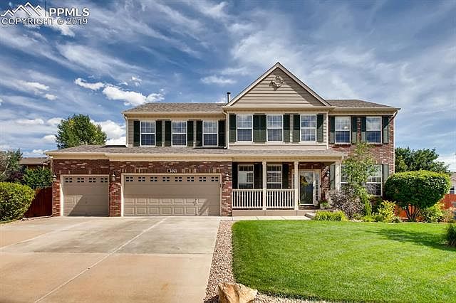 Shows like a model home in the desirable D-20 school district on a large private lot w/amazing mountain views! This home has 5 bed/4 bath/study and 3 car garage. Gourmet kitchen, double ovens, pantry, beautiful wood floors & walk-out access to a stamped concrete patio. Upstairs has a spacious master bedroom w/attached 5-piece bath, walk-in closet, 3 bedrooms, A/C, laundry w/utility sink. Newly finished basement. Close to the Air Force Academy, easy access to I-25 and Powers. Shopping & restaurants close by. Great location! Newer carpet throughout, private fully fenced in backyard, all appliances included! French doors. Covered front porch, coach lights, professional landscaping, built in book shelves in study, bay window in the dining room, french doors to the study and master bed room, newer 70 gallon hot water heater, garage service door and more...