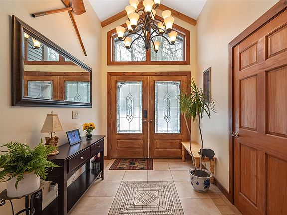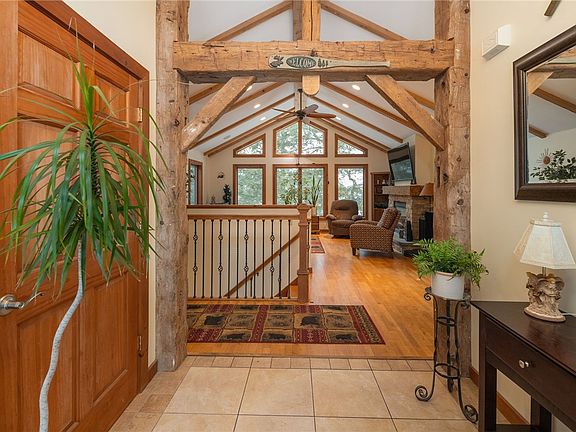 Inside, the main level welcomes you with 1850 reclaimed barn beams accenting the ceilings, radiant heat flooring throughout, and abundant natural light. The living room with Cathedral ceilings centers around fabulous views of the lake and a gas fireplace. The dream kitchen is finished with granite countertops, stainless appliances, double ovens, a wine chiller, and a butler’s pantry.
