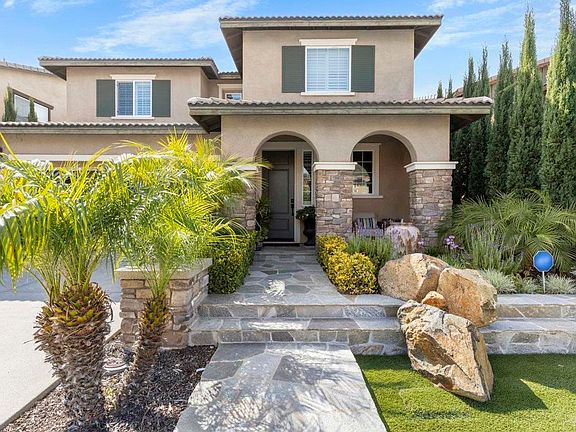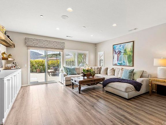 Gorgeous model Horse Creek Ridge home with downstairs master bedroom! This stunning turn-key property in the highly sought-after Westbury neighborhood is a true masterpiece of design and luxury. High-end upgrades and designer touches shine throughout this open concept home flooded with natural light and breathtaking views. Additional upstairs loft that could easily convert to a 4th bedroom! As you enter you will be captivated with the flowing floor plan featuring luxury vinyl plank and designer entry wall. The huge open kitchen highlights a spectacular island with granite countertop, white cabinetry, all stainless steel appliances, and pantry. Upgraded pendant lights and designer backsplash add the perfect touch. Built-in cabinets and floating shelving in the family room provide both style and functionality. The downstairs master bedroom is a retreat unto itself, featuring a designer barn door, feature wall, and stunning views of the surrounding hills. The master bath boasts quartz vanity, a soaking tub with installed flatscreen TV, and a walk-in rainfall shower. Step outside to your backyard oasis, professionally landscaped with water features, tropical greenery, plants, trees, artificial turf, and beautiful stonework. Relax in the hot tub while enjoying panoramic views of local wineries and avocado groves – the perfect spot to sip wine and watch a breathtaking sunset. Upstairs, discover additional living potential with another bedroom as well as spacious loft. The upstairs bedroom features a walk-in closet and built-in desk, perfect for a home office or study nook. An additional full bathroom with quartz vanity completes the upper level, offering both convenience and style. Additional highlights include: tankless water heater, whole house speaker system, recessed lighting and chandelier, remote motorized window blinds in family room, Security cameras, AC, Hanging storage in garage, Vinyl fencing, nearby playground, laundry room,low payment leased solar, and 20 cabbage patch rose bushes. The community offers incredible amenities including two separate pool areas, spa, clubhouse, playgrounds, parks, and athletic fields. Just a short drive to Temecula's renowned shops, restaurants, and wineries, with easy freeway access to San Diego and beaches, and proximity to great hiking trails. You will love this turn key home in a perfect location!