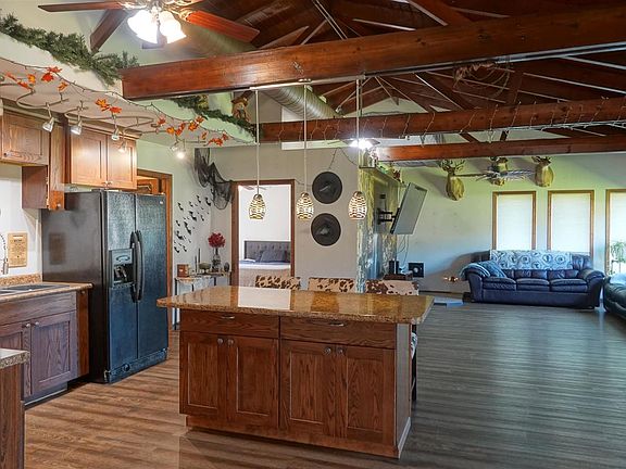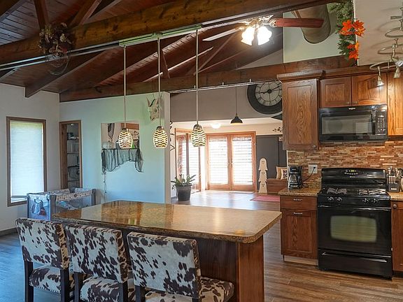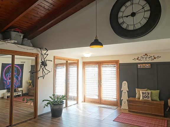 Welcome to this gorgeous 2-bedroom, 1-bathroom home featuring stunning cathedral ceilings and exposed wooden beams throughout. This beautifully single-level, open-concept home offers a perfect blend of comfort and style. The home offers casement windows, forced air heating, and a heated bathroom floor?perfect for those chilly mornings. The kitchen and living areas are thoughtfully designed for modern living, while the warm wood accents add a touch of rustic charm. Off the main bedroom you can walk out to a fenced in patio to enjoy that morning cup of coffee. In addition to the main house, the detached garage features a efficiency apartment with a private entrance, kitchen, and full bath. This flexible space is ideal for rental income, a guest suite, or an additional hangout spot. Don't miss the opportunity to own this unique and versatile home!