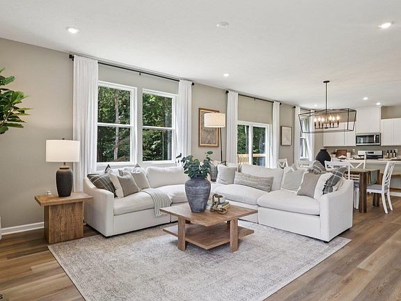 Warm-toned luxury plank flooringPristine white cabinetsBeautifully finished basementModern open-concept main floorStone-front exteriorSense of privacyCovered front porch