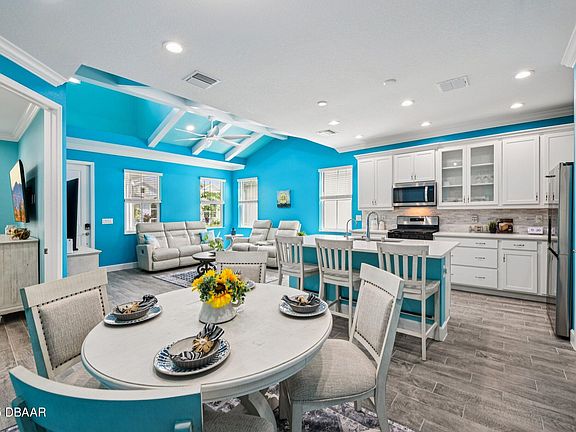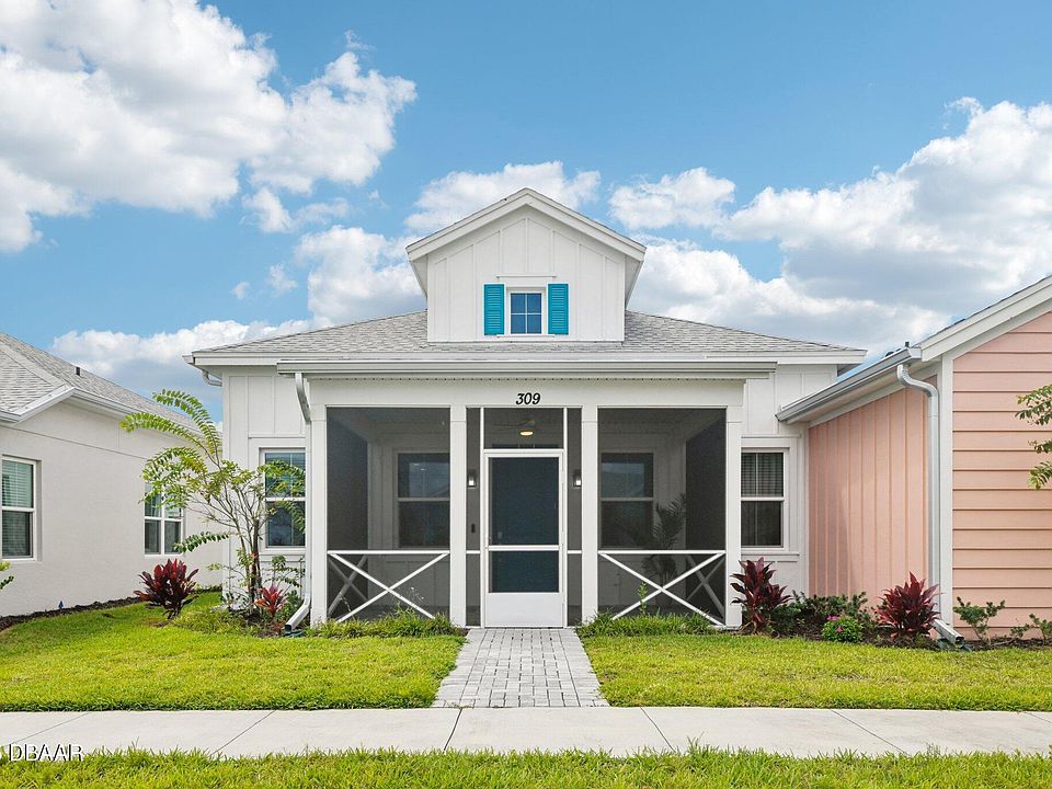 Welcome to the carefree lifestyle at Latitude Daytona Beach! Just bring a suitcase! This bright and airy cottage is less than a year old and comes fully equipped with top-of-the-line furnishings and many upgrades including vaulted ceilings with decorative beams, ceramic tile flooring, crown molding and more! The living area is open and features a gourmet kitchen, quartz counters, stainless steel appliances and a gas range. The primary suite offers a peaceful retreat with a spa-inspired bath featuring dual vanities with quartz counters and a tiled, glass-enclosed rain shower. The 2 car garage is oversized and offers shark coating floors and plenty of room for storage. At Latitude, you'll enjoy a vibrant gated community with all of the amenities including a tropical lagoon-style resort pool with daily entertainment, plus two additional heated pools including a sports pool and indoor lap pool. Stay active with tennis, pickleball, bocce, and volleyball, or the dog park. Tour today!