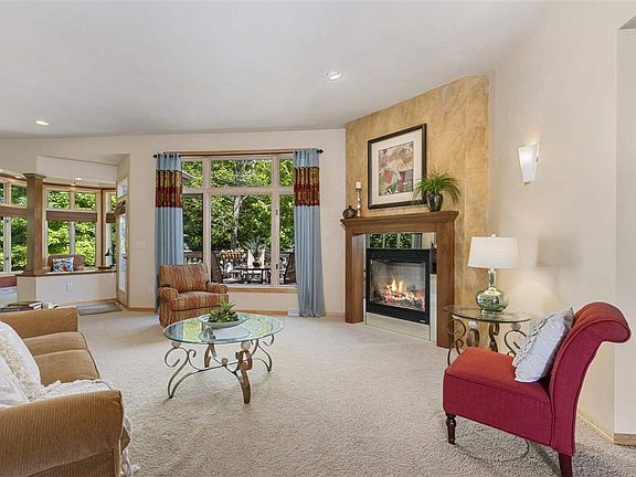 Appeal starts at the curb in this incredibly spacious, beautifully maintained open concept condo. The treeline bordering the back lot line jumps right in as you enter, enhancing every inch of the main level living space. Living room with gas FP and built-in bookcase seamlessly flows to kitchen, dining area and a cozy extension where a good book can be enjoyed. South wing hosts Master Suite with fireplace and second bedroom with private bath. A half bath and laundry complete the main level. LL boasts large great room, 3rd bdrm, office and full bath, plus abundant storage options.