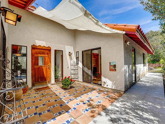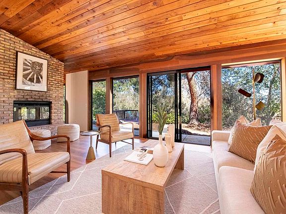 Tucked away on a peaceful .91-acre lot, this hillside retreat offers sweeping mountain and valley views from its elevated perch. A stunning wall of windows brings the outdoors in, flooding the open living area with natural light and showcasing the ever-changing beauty of the landscape. Vaulted natural wood ceilings add a sense of warmth and tranquility to the airy interior. At the heart of the home, a dual-sided fireplace provides cozy ambiance for both the inviting living room and the adjacent dining area—perfect for entertaining or quiet evenings in. The spacious kitchen features granite countertops and generous workspace, ideal for culinary creativity. A separate laundry room adds everyday convenience. The primary suite is a restful haven, filled with soft light and featuring high ceilings and a luxurious en-suite bath with a Roman-style tub and walk-in shower. The two bedrooms open onto a charming tiled courtyard-style patio—a private, peaceful spot to enjoy your morning coffee or unwind at the end of the day. A generous view deck extends off the main living area, offering a spectacular vantage point for sunrise reflections or sunset gatherings. The expansive rear yard provides ample space for a garden, pool, spa, or future outdoor entertaining areas. Additional features include a dog kennel, storage shed, and plenty of room to grow. Recent upgrades include a new roof, ductless mini-split heat & AC units, and all-new concrete driveway and walkways. With nearly an acre of land and additional street-level access from the lower portion of the lot, the possibilities here are as inspiring as the views. This is more than a home—it's a tranquil retreat where nature, comfort, and style meet.
