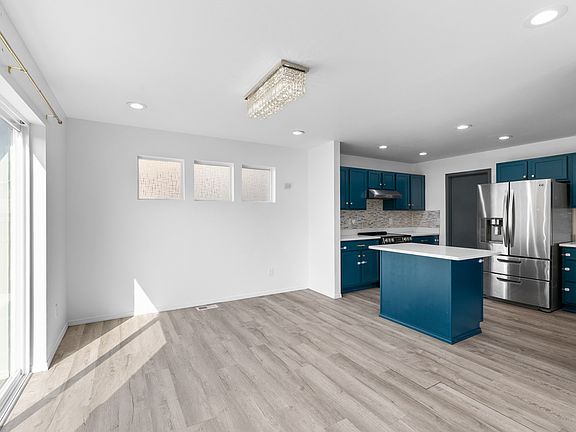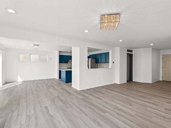 Recent upgrades include a new roof, newer flooring throughout, updated kitchen and bathroom countertops, teal kitchen cabinetry, stainless steel appliances, modern chandeliers, ceiling can lights, and fresh paint.