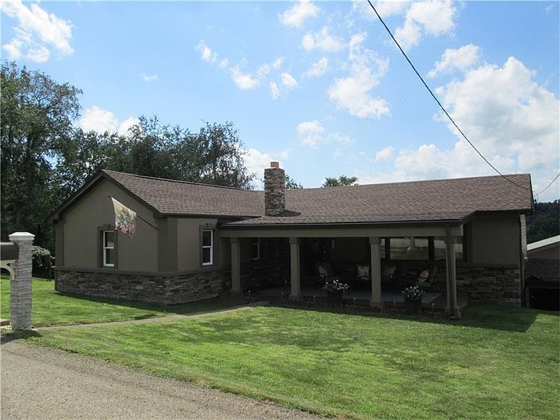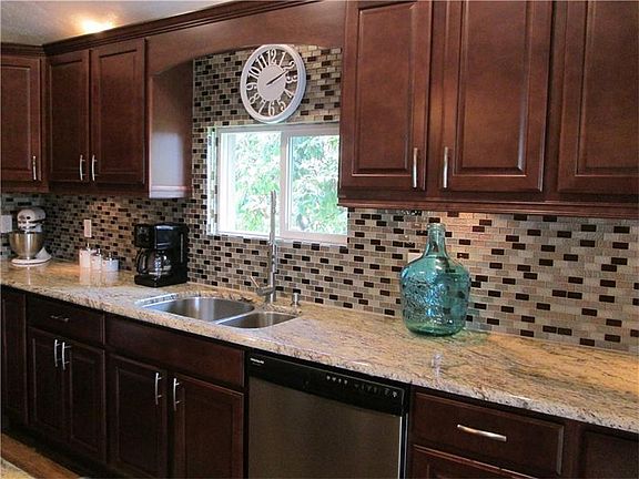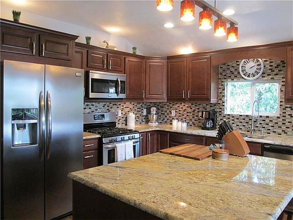 Wonderful updates to this ranch home on dead-end street. Exterior of home with new roof, windows, stone & vinyl siding and E.I.F.S (exterior insulating finishing system) creates nice curb appeal and provides great insulating factor. Kitchen remodel with SS appliances, quality soft close cabinets, granite countertops, and large center island is a cooks dream. New hand-scraped laminate flooring throughout kitchen, LR, foyer. LR is light & bright & nice size for entertaining. Additional room on lower level has served as 3rd bedroom. Lower level has large laundry, wood burner, shower, storage space & opens to outside 1 car covered parking. Oversized 1 car detached garage with room for large workshop. Sheds for added storage. Relax on covered 10x22 front porch, watch awesome sunsets from the covered rear deck, or cool off in the 18' round above ground pool. Enjoy the outside with its grape arbor, fruit trees, and large garden. Move-in ready condition and great convenient location.