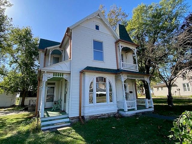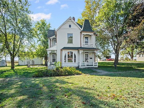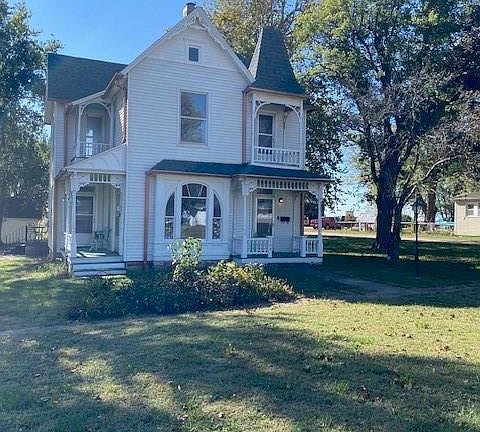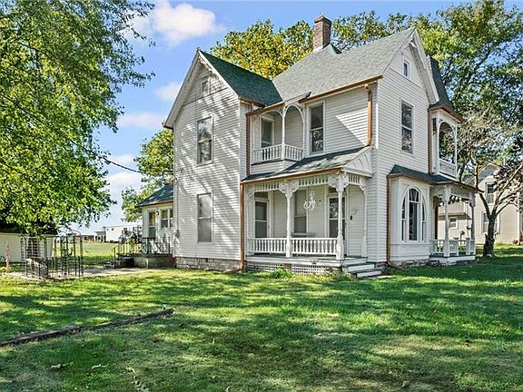 This well-maintained Victorian home is situated in the picturesque town of Denton, KS. Built in 1885, the property features two ornate front porches and a large ornate picture window, highlighting its classic architectural charm. Recent upgrades include a new roof and copper-colored guttering. The residence sits on a spacious 1-acre lot, providing ample space for outdoor activities, and includes both a garage and a shed for storage.