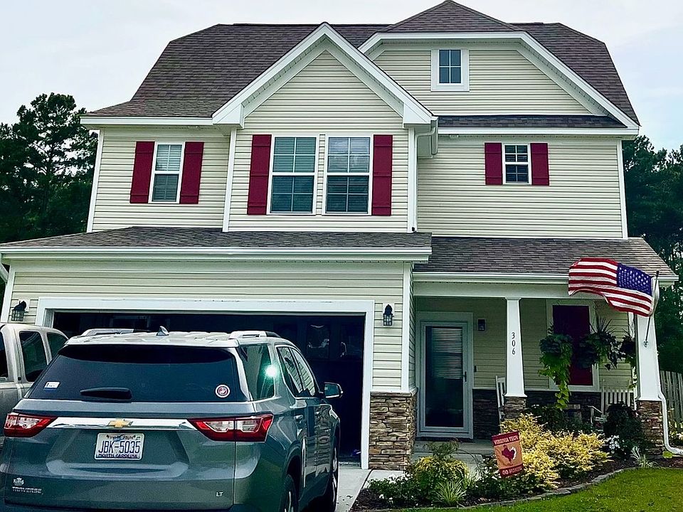 Welcome to this stunning 4-bedroom, 2.5-bathroom home located in the highly sought-after neighborhood of Peyton's Ridge in Hubert, NC. This property boasts a two-car garage, providing ample space for vehicles and storage. The kitchen is a chef's dream, equipped with stainless steel appliances and granite countertops. Additional storage is available in the outdoor shed. The home's exterior features are just as impressive, with a covered front porch and a screened back patio, perfect for enjoying the outdoors in any weather. The large fenced backyard includes an outdoor fire pit, perfect for entertaining. The neighborhood amenities are sure to impress, with a dog park, walking trail, and pond. Please note, no cats or dangerous breed dogs are permitted. This home offers a perfect blend of comfort, style, and convenience. Don't miss out on this gem in Peyton's Ridge!