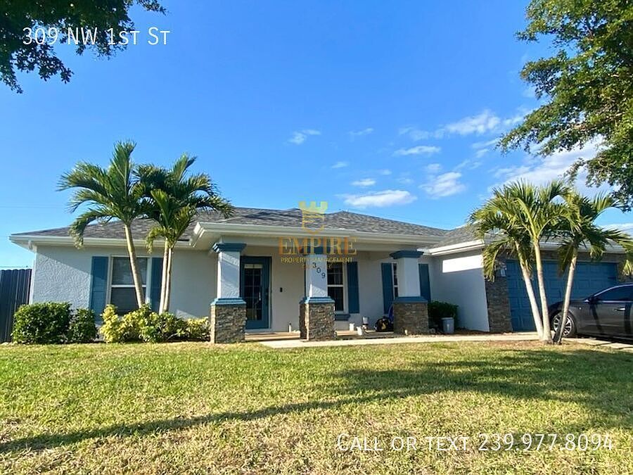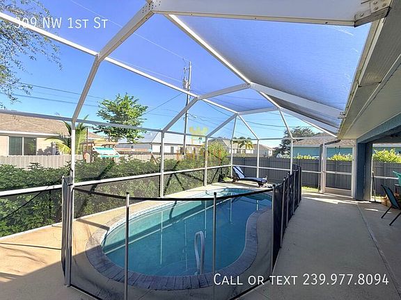 This gorgeous 4 bedroom, 2 bathroom home is located in a great area of Cape Coral and offers everything you need for comfortable Florida living! Enjoy a large screened-in lanai with a stunning custom hardwood ceiling, sparkling pool with safety fence, and a fully fenced backyard featuring a fire pit, playset, and outdoor kitchenperfect for entertaining! Inside, you'll find laminate flooring throughout, high ceilings, and plenty of natural light. Also includes a washer and dryer and is on city water. A lovely home in a fantastic location!