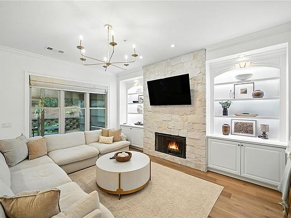 Stunning stone gas fireplaceCustom built-insWarm brass fixturesExpanded patioStone backsplashLuxury wood flooringQuartz counters