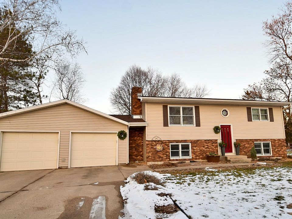 Enjoy this backyard oasis on almost 1/2 acre-while you're sitting under a shade tree or on the updated deck and pergola. Step inside and appreciate oak floors on the upper level. New entry light fixture, fresh low VOC paint used w/ any upgrades since 2002. New dishwasher & microwave (2018), new laundry room sink, washer and dryer. Fireplace updated in 2021. New carpet throughout lower level. Separate entrance to lower level through the 800 sqft garage. Current owner has used lower level as rental income. All of this situated on a quiet cul-de-sac within a short walk to the park, pool, ball fields and downtown. 4-bedroom 2 bathroom-rent out lower level to make your house payment. Schedule a showing today!
