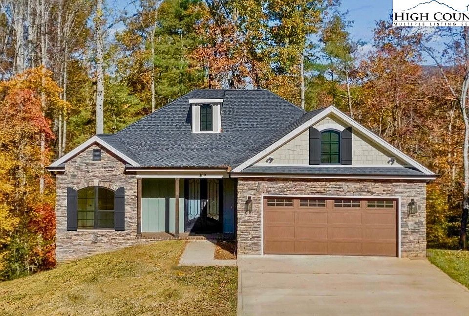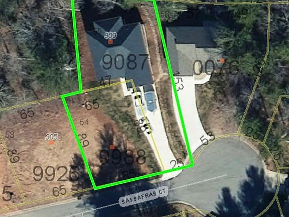 One-Level-Living, no HOA fees, nestled on a cul-de-sac in the serene "Parkview" neighborhood. 309 Sassafras Ct. is a like-new 3 BR 2 BA home showcasing a harmonious blend of timeless elegance and contemporary sophistication. On the exterior are low maintenance composite board and batten siding and stacked stone. Gutter Guards installed Aug '25. Arched windows and shutters create timeless rustic charm. The garage is level with the main floor, and the concrete driveway is 82 ft long and offers an additional 1,400 sq ft of parking........Arched double French doors with wrought iron detail create a grand and romantic entrance to the open floor plan. Step inside the heart of the home where vaulted beamed ceilings and a floor-to-ceiling stone, gas-log, fireplace overlook the great room. Hardwood floors tie in the dining room and kitchen. Create an alfresco dining space on the large back porch, overlooking the woods in back........Muted and elegant style continues into the ensuite Primary Bedroom with tray ceiling and two walk-in-closets with custom shelving and rods. The private bath features a double vanity and lovely walk-in shower with thick glass door........Additional main floor features: two more bedrooms, a full bath, and laundry room with built in cabinets and utility sink........ The full basement offers a myriad of opportunities for creating even more living space and there is a second back porch as well........ The property includes the adjacent lot. Covenants and restrictions protect the quality and value of the neighborhood but there is no Homeowner Association and there are no HOA fees........