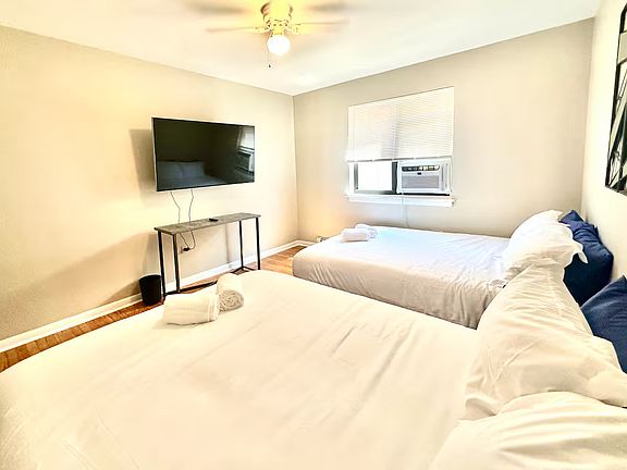 1 spacious bedroom with two queen beds, hotel-style linens & smart TV