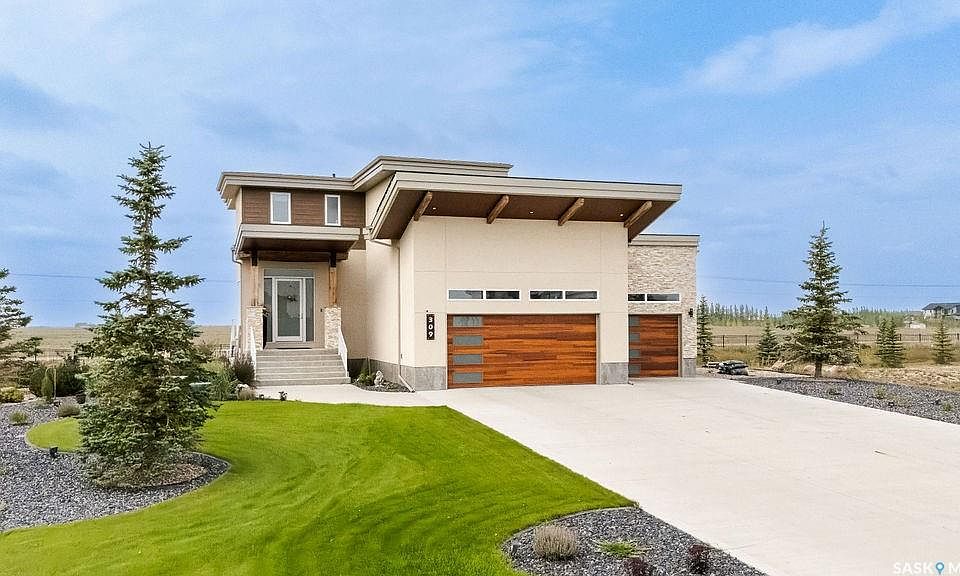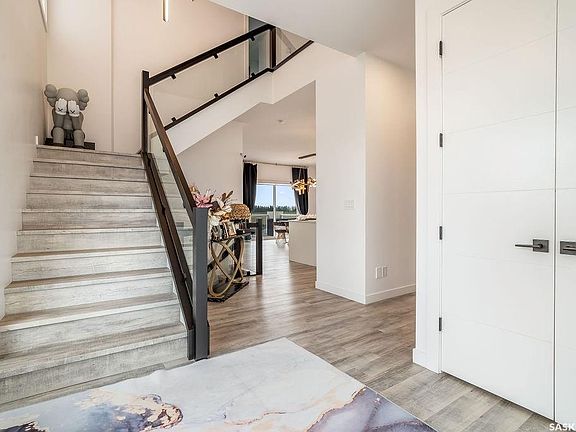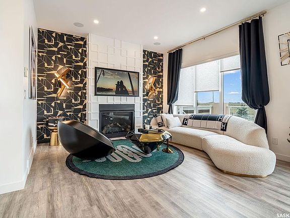 Luxury Living in Spruce Creek Estates – Pool, Walkout, Triple Garage This exquisite two-storey 2018 Stars Lottery Home, is located in the prestigious community just minutes east of Regina. From the moment you arrive, the curb appeal captivates with modern architecture, cedar and stone accents, and beautifully manicured landscaping. Inside, the open-concept design strikes the perfect balance between luxury and comfort. The chef’s kitchen makes a bold statement with crisp white lower cabinets, sleek black glass uppers, quartz countertops, and a huge island, providing both function and style. The living room, anchored by a gas fireplace, flows seamlessly into the dining room, which opens onto the deck where you can enjoy breathtaking Saskatchewan sunsets. Upstairs, the home continues to impress with 3 bedrooms and a bonus room enhanced with a custom JMS mural wall. The Primary suite has been beautifully updated, it is spacious, has a walk in closet and 5 piece ensuite. With chic tiled floors, updated cabinetry, a custom-tiled shower, a stand-alone soaker tub, and double sinks, this retreat feels like a luxury spa within your own home. The 2nd floor also features a full bathroom and laundry room. The fully developed walkout basement is perfect for entertaining or family time, with a gas fireplace in the family room, wet bar, 4th bedroom, bathroom, and spacious sunroom making it an ideal extension of your living space. Stepping outside, you’ll find a private backyard oasis designed for both relaxation and fun. A raised deck and patio overlook lush green space, putting green, and in-ground pool. Everything you need to enjoy hot Saskatchewan summers. The triple attached garage has 12-foot ceilings, epoxy-coated floors, and is heated. With in-floor heating in the basement, newer flooring, cabinetry, paint, & lighting throughout, as well as a home audio system and a fully fenced and landscaped 1/2 lot, this home delivers executive style with everyday comfort.