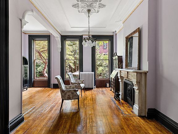 309 Vanderbilt Avenue is a classic & historic four story Neo-Grec style brownstone located in Prime Clinton Hill/Fort Greene. From the street it looks like a three story but the top floor is set back so it cannot be seen from the street. Built in the 1877 by the developer Benjamin Linikin, it has the classic exterior details such as a high stoop, enormous double doors, round-arched reveals, and pediments on incised brackets. Owned by this family for over 50 years, everything is in good working order and has been well maintained. There are tons of original architectural details in the interior, Many of the rooms have marble mantles & fireplaces ( nonworking) .The interior reads as it was in 1877, all the details remain: parlor pocket doors, wedding cake plaster ceiling detail, all the original entry way doors and interior doors, and stairway bannisters to name a few. Some of the original light fixtures date back to before electricity and were gas. 309 has been used as a single family although it is a two family legally. It would be easy to use as a two family and create a first floor rental. The building measures 18.7x45 feet and the lot is 85 feet. Size wise it is about 3200 interior square feet with 4 bedrooms and a potential 5th bedroom, 3 baths and a large rear yard.The first floor is the garden level and has a formal dining room and large eat in kitchen with a door to the garden. The kitchen has an enormous island and plenty of room for a large sized table too and also worthy of note, a huge walk in pantry. The dining room is in the front looking out to Vanderbilt Avenue and has a marble mantel fireplace. There is a small but full bath off the kitchen with a shower. The second floor is the parlor floor which has a front and rear parlor. Both have lots of period details with lavish plaster ceiling detail, huge pocket doors and fretting, two marble mantel fireplaces (not working) and face east and west. The third floor has three bedrooms and a hallway bathroom with a classic Waterworks-esque clawfoot bath tub with a chrome exposed shower and rainhead. In true Victorian fashion, the marble topped vanities and sinks are separate from the hallway bath and are in their original location, the hallway behind the bath. If one wanted to redo the bath and enlarge,/reorganize it, there are several closets that back onto the bath, making a redesign pretty accessible. The fourth floor has a large tiled and windowed bath with a shower stall and an east facing bedroom. There is the potential for the 5th bedroom/playroom/office in the sloped ceilinged front room used as an attic. While it has a peaked ceiling as a result of the aforementioned set back, It has a skylight and could easily converted into a bedroom, office or playroom. 309 is located on one of the most ideal blocks, midway between Dekalb Ave and Lafayette. It is close to everything including, shopping, stores, and the areas reknown restaurants. It is also very close to the historic Fort Greene Park and all the weekend activities like the Farmers Market.