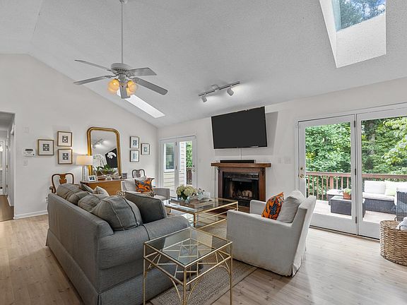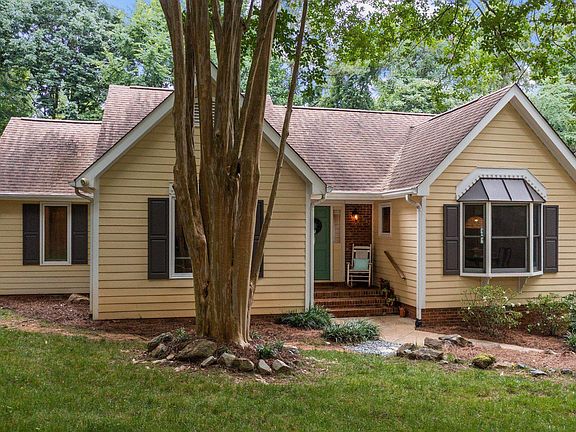 Live, work and play! Absolutely charming cottage bungalow home located minutes to quaint eateries, breweries & coffee w/ easy access to UNC and Duke! This adorable ranch features a gorgeous, spacious renovated bathroom w/ designer touches-- furniture style dual vanity with granite counters, marble-like bath/shower and tile flooring. Light & bright, the great room’s French doors flanking the wood burning fireplace, open to an expansive deck offering private views perfect for entertaining OR lounging w/ a good book on a lazy summer day. Cathedral ceiling, skylights & hardwood flooring in the great room create an open and airy space. Like to cook? Charming & large eat in kitchen w/ built in bay window bench seat, gas range & SS appliances. Primary suite offers hardwoods, bathroom access & lush backyard views. Custom built ins for books & collections as well as stylish lighting in secondary bedroom for that home office OR simply another bedroom. Let’s not forget about the tall crawl space for extra storage AND the 2 car parking pad too! Walk to tennis/pool or hop on trail for a quick bike/run. Total perfection!