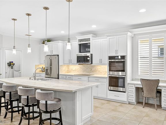 The completely remodeled gourmet kitchen is a showstopper—featuring an enlarged island, Corian marble-look countertops with full height backsplash, custom extended cabinetry, built in pantry cabinetry (including slide-out drawers for convenience), double ovens, radiant cooktop, wine refrigerator, designer lighting, and even a built-in breakfast TV above the microwave. Every detail has been thoughtfully crafted for both beauty and functionality.