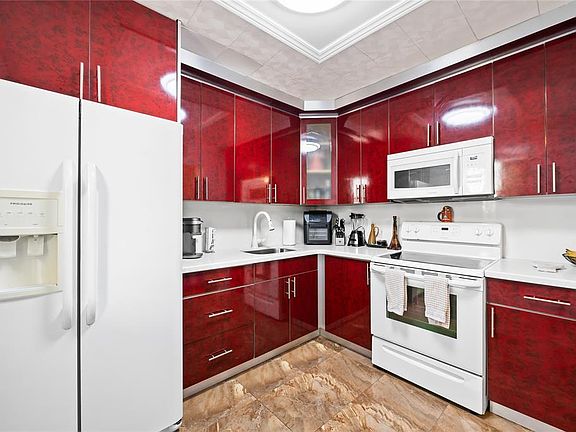 Newer vinyl flooringElegant onyx countertopsEnclosed patioHigh-gloss kitchen cabinets