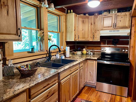 Escape the hustle and bustle and find your tranquil retreat at 3090 Shamrock Lane in Birdseye, Indiana. This charming log cabin, constructed in 2000 and expanded in 2019, offers a perfect blend of rustic allure and modern convenience, all just minutes away from Patoka Lake, local wineries, and breweries. Imagine relaxing on your wrap-around covered porch, surrounded by the sights and sounds of nature—whether it's bird songs or moonlit nights, this space promises peaceful moments. The cabin spans 2367 square feet and is ideal for weekend getaways or full-time country living. Step inside and be greeted by stunning hardwood floors, solid 7” timbers, and an abundance of new Anderson windows framing beautiful views of the surrounding wildlife. The spacious kitchen was completely remodeled, with its ample cabinets and counter space, includes a new refrigerator and range/oven. It opens to a 19 x 10 dining area, perfect for entertaining. On the main floor, you'll find a 14 x 12 bedroom with an en-suite bathroom featuring a walk-in shower. The 30 x 12 family room boasts a wood-burning stove and plenty of natural light, while a 13 x 11 space offers options for a game room or additional sitting area. Upstairs, two loft areas await: a 12 x 16 space ideal for two beds and a 30 x 23 loft with a built-in bed, multiple cove areas for extra beds, and space for recreation or games. The loft also provides a stunning view of the cabin’s addition. Outside, a 24 x 30 outbuilding with an eagles roost deck connects to a 15 x 15 remodeled area (not included in square footage of house). This versatile space could serve as a guest area, office, or den. The outbuilding is also perfect for storing vehicles, boats, ATVs, or other recreational gear. Nestled on three lots, this property offers breathtaking views, ample trees, and the ultimate escape from city life. The spacious driveway accommodates extra room for a boat, pontoon and/or extra parking, making this cabin a must-see for anyone seeking a serene retreat. Pictures and descriptions can’t fully capture its charm—come see it for yourself! Included in sale: Refrigerator (2025), Range/Oven, Washer/Dryer Combo (2025), Window Treatments, Heat Pump (July 2025)