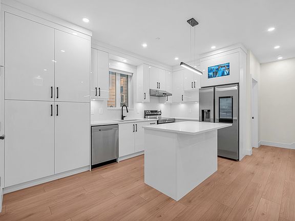 NO STRATA FEE! Modern front-unit home in a brand-new triplex. This 2-storey home offers 3 spacious bedrooms and 3 full baths in Joyce-Collingwood Vancouver. Features a stylish living room with custom TV cabinet, sleek kitchen with S/S appliances and large island, plus A/C, HRV, heat pump, security system, EV-ready parking, and fenced front & back yards. Includes ensuite laundry, ample storage, and 2/5/10 warranty. Convenient location near schools, parks, and SkyTrain stations. Built by a reputable builder. Easy to show! Open House Oct 25th Saturday 3-4:30pm.