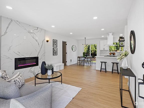 Immerse yourself in easy living in Federal Way! Tastefully updated 1level on corner lot features an oversized front lawn & fresh landscaping. Enjoy airy, open concept living w/a modern aesthetic. Gleaming kitchen boasts timeless white cabinets, SS appl, custom tile backsplash & peninsula w/eating bar. Host loved ones in luminous living room w/cozy electric FP w/full-height tile surround & entertain seamlessly via slider from dining area 2back patio. Chic & comfortable full bath includes stylish tile flooring, modern fixtures & shower/tub combo w/tile surround. 3 generous sized bedrooms + a flex room/office off the living area complete the home. W/D closet conveniently in hallway. Fully finished 1-car garage provides ample parking & storage.