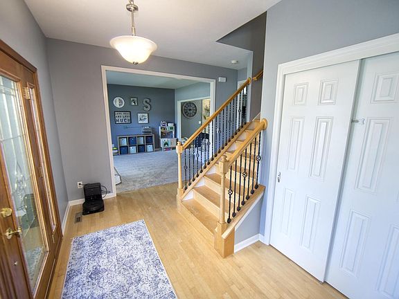 Beautiful Colonial in the highly desirable Yorkshire Grove Subdivision! Nestled on a tree-lined lot, this home offers 4 generously sized BRs, 2 full BA & 2 half BA. The inviting family room features a stunning floor-to-ceiling stone GFP and flows seamlessly into the KIT w/granite counters, maple cabinets & hardwood floors. Sliding glass doors open to a private screened deck, perfect for relaxing while enjoying serene views. The spacious master suite includes a WIC & private BA w/double vanity, walk-in shower, and soaking tub. Convenient 1st floor laundry. The bright LL RR w/full-size windows is ideal for entertaining, complete with a half bath plumbed for a shower. Attached 2.5 CAR GAR completes the package. Excellent location close to award-winning schools, parks & more! View the video!