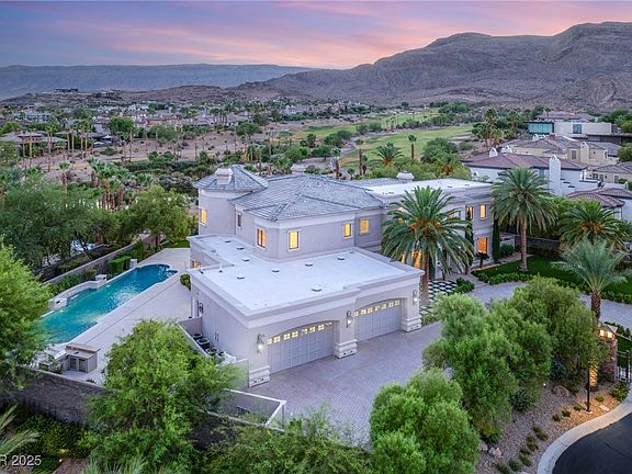 Perched on a premier lot in Red Rock Country Club, the two-story reimagined estate offers an exceptional blend of modern luxury, craftsmanship and breathtaking views. 8,724 square feet of interior space including 5 bedrooms, an office, den, 6 bathrooms and a 4-car garage, this home has been meticulously renovated to the highest standard, showcasing level 5 designer finishes. Soaring ceilings and walls of glass flood the home with natural light and an open floor plan. The elevated setting captures panoramic views of the surrounding mountains and a tranquil water feature at the lush golf course. Canadian white oak herringbone floors, custom vanities and fluted marble fireplace walls. The spacious primary bedroom has a sitting room, double closets and spa-like bathroom. The pool has been completely upgraded with pebble tech, stone coping, and designer tiles. Located in the heart of Summerlin, Red Rock Country Club is one of Las Vegas’ most coveted communities.