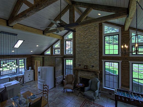 The charm of the chestnut logs. The parlor with the original stone fireplace and wood floors is a fabulous environment for relaxing, playing games, sipping a drink by the fire, and reading a book. The great room's large windows let in an abundance of sunshine. The great room has lots of space for friends and family. We have 138 acres just down the road that can also be purchased for hunting, hiking and keeping livestock.
