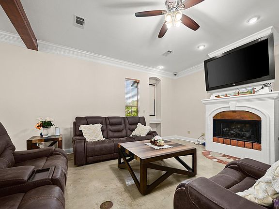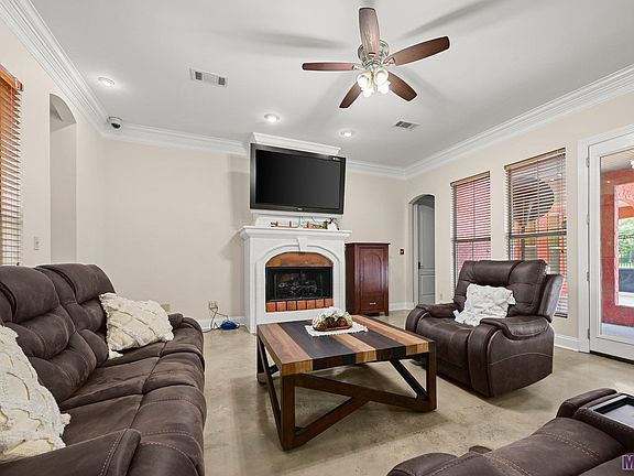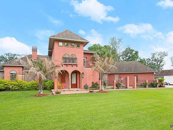 This exquisite custom-built home nestled on over 2 acres in Denham Springs has everything you'll ever need. As you enter through the grand foyer, your eyes are immediately drawn to the stunning wrought iron and wood staircase, setting the tone for the features that define this home. From arched openings and custom mantles to granite countertops and stained glass windows, every element has been carefully curated to evoke the charm of this one of a kind home. Entertain effortlessly in the spacious open floor plan, that over looks the beautiful backyard. The gourmet kitchen is a chef's delight, with custom cabinetry, a five-burner gas cooktop, convection oven, pot filler, and a vegetable sink. Wash dishes from the kitchen sink that overlooks the fountain in the courtyard. The primary suite is the perfect place to relax with a seating area next to fire place and has access to the backyard oasis. The primary bath has dual sinks, a whirlpool soaking tub, separate shower and large closets. Down the hall, you can relax and watch a movie in the media room/ guest bedroom that also has easy access to the backyard. Upstairs, you'll find 2 guest bedrooms with a shared bathroom. Each bedroom has a vanity area. Step out onto the rear balconies from either bedroom to enjoy views of the serene pond or pool area. Enjoy resort-style living with a remote-controlled heated fiberglass saltwater pool, complete with hot tub, an outdoor bar area, outdoor shower, tennis courts, and pond.