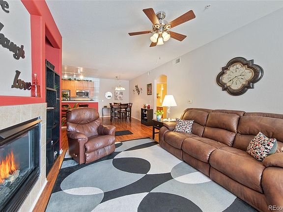Welcome to this beautiful home in Blue Sky at Vista Ridge! This lovely 2 bed, 2 bath ground floor condo is a one-owner, well maintained home that will last for years. This spacious floor plan lets in lots of natural light and is very peaceful and quiet. The open concept main living space flows nicely into the kitchen and dining area. There are two patios for relaxing outdoors which have space for a BBQ grill and patio furniture, as well as a storage closet off the bedroom patio. The primary suite offers a huge walk-in closet, an ensuite bathroom with 2 sinks, and an updated walk-in shower. You will find the unit nicely appointed with granite slab countertops (kitchen and bathrooms), stainless steel appliances, a brand-new hot water heater, included washer and dryer, gas log fireplace, and new roof (2022). Pet free and smoke free. Blue Sky features walking paths, two parks, a swimming pool, hot tub, exercise room, and clubhouse, and is situated right next to the beautiful Colorado National Golf Course! Easy access to the on-street parking and close to nearby shopping and restaurants, as well as quick access to I-25.