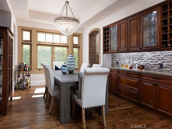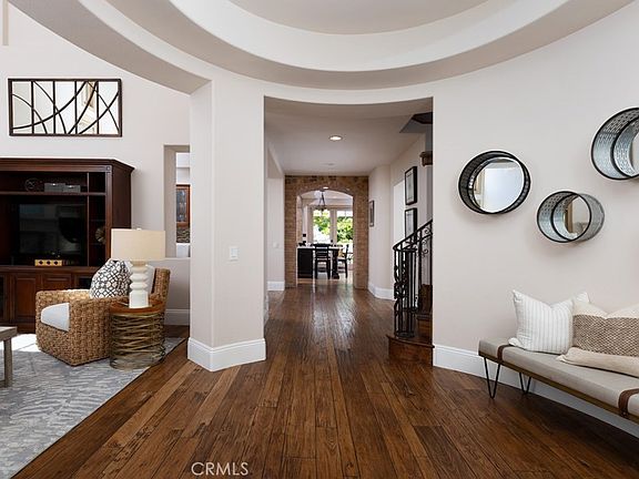 Welcome to 30951 Via Bravo, an exquisite residence nestled in the prestigious guard-gated community of Marbella Country Club Estates in San Juan Capistrano. This exceptional home offers the perfect blend of luxury, privacy, and an unparalleled country club lifestyle. Upon entering, you'll be captivated by the soaring high-beamed Cathedral ceilings and the warmth of the 3/4" hand-carved hickory hardwood floors. The state-of-the-art gourmet kitchen is a chef's dream, featuring custom cabinetry, dual islands, a six-burner commercial-grade Wolf range with a double griddle and pot filler, Wolf double ovens, and a 48" Sub-Zero refrigerator/freezer. Additional kitchen highlights include a convenient farmhouse sink, a charming bay window, and a reverse osmosis water system. The open-concept design seamlessly connects the kitchen to the family room, creating an inviting space for relaxation and entertaining. A custom wrought iron staircase leads to a private upstairs library, complete with floor-to-ceiling cherry wood bookshelves and cabinetry. The master suite is a true sanctuary, showcasing 8-foot solid wood arched doors, dual copper sinks, a jetted jacuzzi tub, a multiple head shower, a bidet, and a spacious walk-in closet. Throughout the home, you'll find custom stonework and an advanced audio system, providing both elegance and modern convenience. Indulge in outdoor living in the beautifully landscaped backyard, featuring a built-in fireplace, a comforting rock waterfall water feature, and a fully equipped BBQ and bar area—perfect for hosting unforgettable gatherings. Situated on a secluded corner lot on a private cul-de-sac, this stunning property offers a 3-car garage and is move-in ready. Marbella Country Club is within minutes and offers access to world-class amenities, including tennis, swimming, a 18-hole golf course, and more.