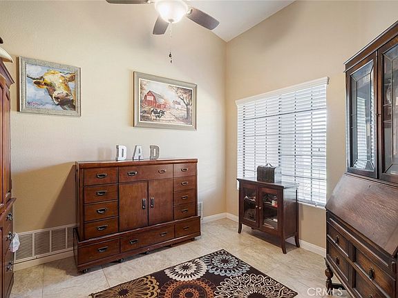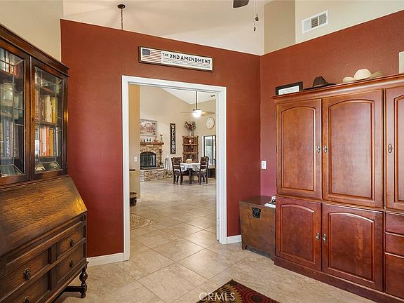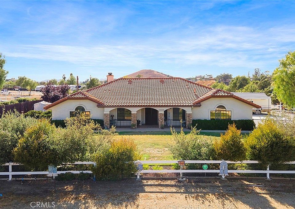 Gorgeous single story POOL HOME ON 2.42 ACRES OF HORSE PROPERTY. HOME has 3 bedrooms, PLUS OFFICE and 2.5 baths . Loacated just 5 minutes to the 215 fwy for an easy commute to anywhere. Beautiful home has double entry doors, with private office right off the entryway. High vaulted ceilings, wood burning fireplace in the living room, dining room combo. lots of cabinet space in the kitchen with a big pantry, newer stainless steel appliances and Corian counters. The large main suite bedroom has a huge walk in closet, bathroom with dual sinks, deep soaking tub, separate shower. Main suite also has its own entrance to the patio and pool area. Convenient laundry room with direct access to the spacious 3 car finished garage. There is a bonus room enclosed patio off the back of the home, great for pets and extra seating. New 12x53ft Alumawood patio with recessed lighting and party area overlooking your salt water pool and spa. There is also a super nice portable spa under the patio as well. The side yard of the home has a beautiful garden area with raised beds and fruit trees. As you tour the yard you will step back in time with old west style buildings including a saloon, insulated shop/office, bunk house with 4 beds, woodworking shed and tractor storage barn, plus many more outbuildings. Continuing on the tour you will enjoy the large pasture area with 24x52 ft horse corrals under a 16x46 ft cover, 46' round pen, chicken coop with runs and lots of space left over for an arena or large barn. Included in the exterior are a fire pit and RV cover, covered wagon. Home is on city water, propane, septic and easy access paved road. Zoned RR for animals.