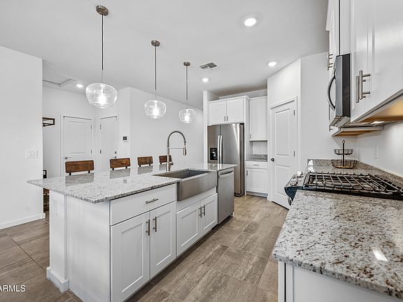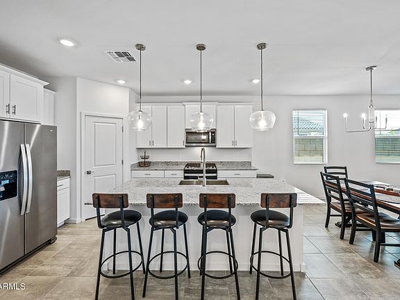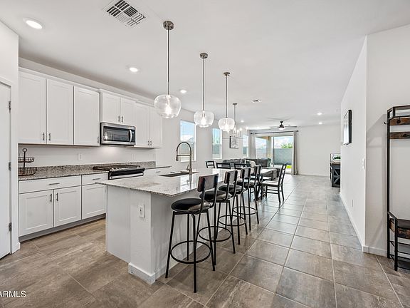 Welcome to your dream home in the sought-after Bella Vista Trails community in San Tan! This spacious 4-bedroom, 3-bath residence offers 2,000+ sq ft of beautifully designed living space. The open-concept layout features a bright kitchen with ample cabinetry and a large island, perfect for entertaining. The floorplan is split - A generous primary suite includes a walk-in closet and spa-like bath. Enjoy flexible living with three additional bedrooms, one bedroom with ensuite!! There's also a separate flex space, and a versatile living area. Step outside to a private backyard with plenty of room to relax or play. Walking trail right next door goes directly to the pool! Price includes two mounted TVS, Blackstone grill, and Freezer. This home combines comfort, convenience and style!