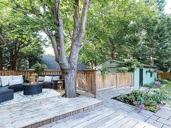 Large lotUpdated kitchenFully finished basementMatured perennials and treesDetached garageLarge patioTranquil landscape