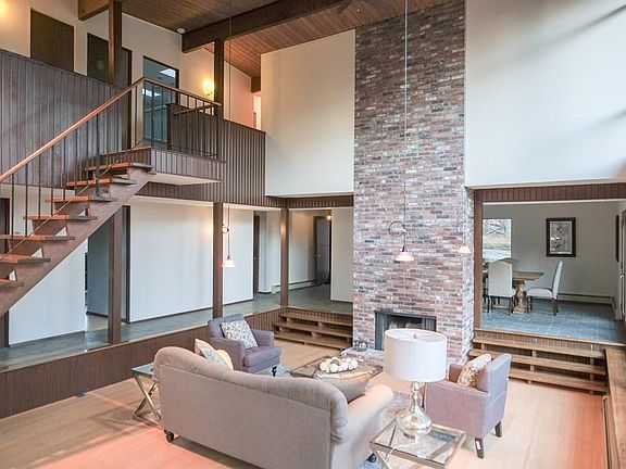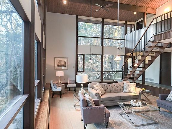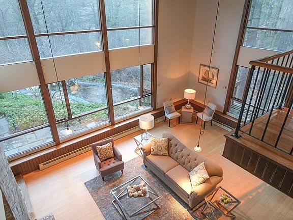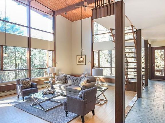 This exceptional mid-century modern home blurs the lines between outdoor and indoor living with walls of 2-story panoramic windows surrounding the cathedral ceiling LR. The open interior flr plan allows the sunlight to stream through the dramatic interior. Set on a clearing among the trees in the Woodridge area this inspiring house overlooks an in-ground gunite pool and hot tub. Kitchen, dining room, office and family room and sunken LR with 2-story fireplace on the first floor. Second fl has a master suite with fireplace and 3 additional BR's. Two-car garage and several decks around the house. Low maintenance yard. Close to Loker Elementary School and easy south side commuting routes. Enjoy Top-rated Wayland school system, nearby Wayland Town Beach, playgrounds, shops and restaurants.