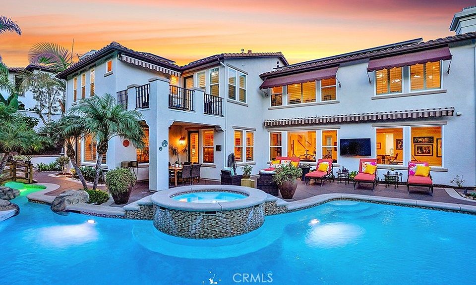 Exquisite Resort-Style Home in Talega’s Coveted Montellano Tract. Pride of ownership radiates throughout this stunning 5-bedroom, 4.5-bath, 4,423 sq. ft. home on an 11,325 sq. ft. lot. This two-story residence blends timeless elegance with modern resort-style living. A dual-step path framed by lush palms and landscaping leads to a gated courtyard with a built-in fireplace and seating area. Inside, the grand formal dining room overlooks the backyard, while the formal living room offers cozy carpet, a fireplace, and abundant natural light. Crown molding and light hardwood floors flow throughout the main level, creating an elegant, open feel. Downstairs features a stylish powder bath and a private ensuite bedroom—perfect for guests or multigenerational living. The gourmet kitchen is the heart of the home, showcasing granite countertops, rich wood cabinetry, a Sub-Zero refrigerator, Viking double ovens, stovetop and hood, dual dishwashers, pantry and a large island with seating and open shelves. A separate breakfast nook complements a butlers pantry with a dedicated coffee/bar. The adjoining family room offers custom built-ins, fireplace, and shuttered windows overlooking the backyard, plus direct outdoor access. A generous laundry room with cabinetry, sink, and counters connects to the three-car garage with new epoxy flooring. Upstairs, elegant white patterned carpet flows throughout. The primary suite features a fireplace, private balcony with retractable awning, and a spa-inspired bath with dual vanities, soaking tub, walk-in shower, and remodeled his-and-hers custom closet. Three additional bedrooms include two ensuites (one with its own balcony) and a third near the spacious loft—ideal for a playroom or office. The hallway includes built-in cabinetry, and all upstairs rooms feature plantation shutters. The resort-style backyard is a showstopper: a sparkling pool with multiple water features, bar seating, and a lazy river leading to a waterfall. A bridge crosses the water to the built-in BBQ area with bar seating, while stairs lead up to a tiki hut with private dining, TV, and a cascading water feature into the pool. Multiple lounging and dining areas surround the pool, the side of the home has built-in garden planters and all planters have individual drip lines for easy care. Additional highlights: new tankless water heater, redone pebble-tech coated driveway, two new gates, new front door, stylish awnings and full exterior paint completed one year ago.