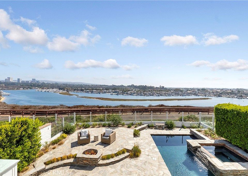 This beautiful CLIFFSIDE home in the Castaways guard-gated neighborhood offers a "front row", spectacular view of Newport bay. The oversized lot and yard is one of the largest on the cliff allowing for a full pool together with a spa and fire pit. LaCantina folding doors create an indoor/outdoor coastal living experience and is as good as it gets. Beautiful kitchen with center- island includes all stainless steel appliances, including SubZero. The spacious primary bedroom also offers include view's with fireplace and balcony. The Castaways community is one of Newport's most coveted neighborhoods, which allows for beautiful walks, hikes, biking and is easily walking to coffee, restaurants, and stores.